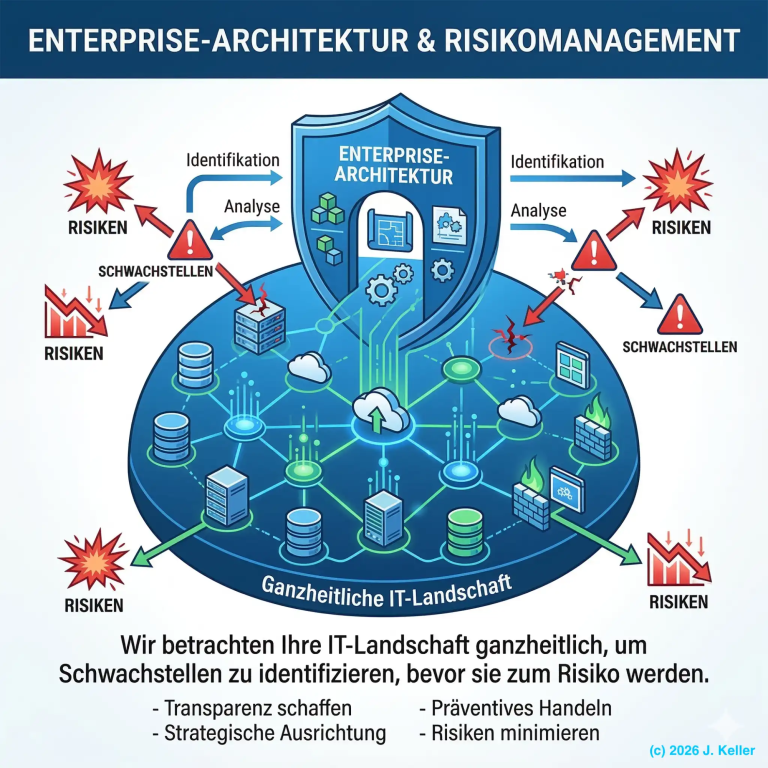 Enterprise-Architektur & Risikomanagement: Wir betrachten Ihre IT-Landschaft ganzheitlich, um Schwachstellen zu identifizieren, bevor sie zum Risiko werden.