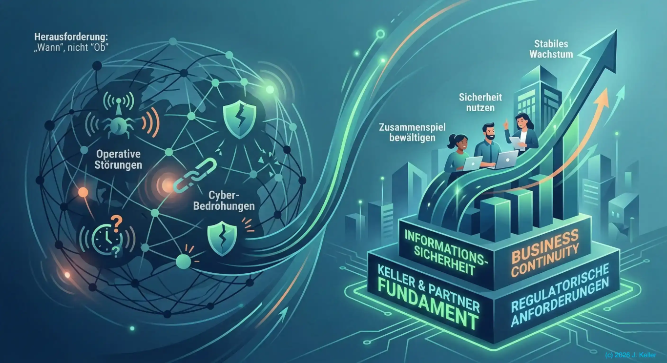 Das Netzwerk Keller & Partner unterstützt Unternehmen dabei, dieses komplexe Zusammenspiel aus Informationssicherheit, Business Continuity und regulatorischen Anforderungen nicht nur zu bewältigen, sondern als Fundament für stabiles Wachstum zu nutzen.